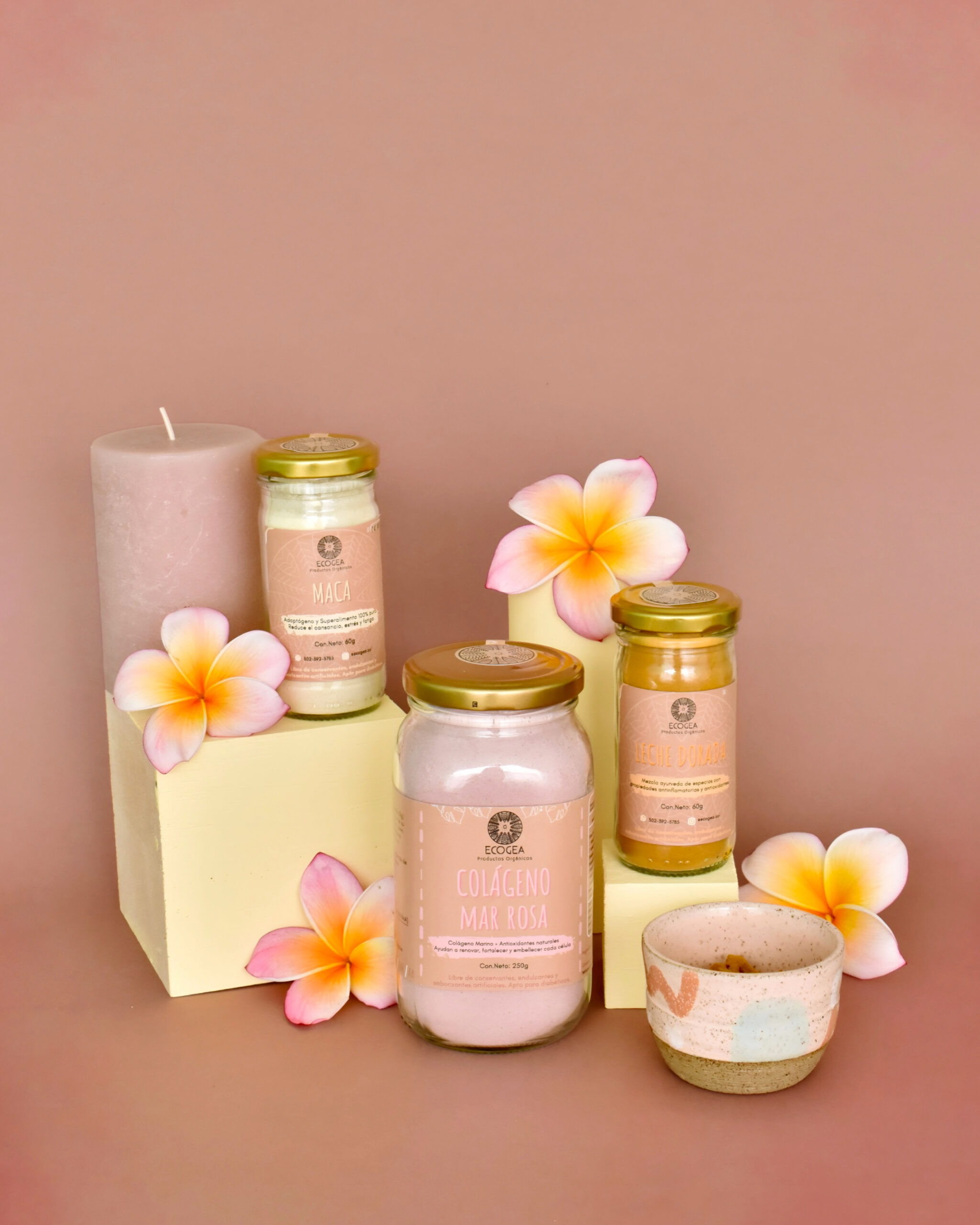 Este innovador kit está compuesto por Colágeno Púrpura, Maca y Leche Dorada, cada uno aportando propiedades únicas que, en conjunto, crean un sistema de soporte holístico para la salud femenina. La combinación de estos productos orgánicos ofrece una solución integral para mujeres que desean no solo mejorar su bienestar físico sino también fortalecer su conexión con el poder y la energía femenina inherente.